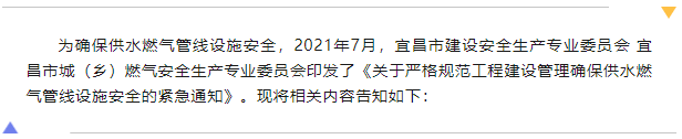 【文件通知】宜昌市關(guān)于嚴(yán)格規(guī)范工程建設(shè)管理確保供水燃?xì)夤芫€設(shè)施安全的緊急通知