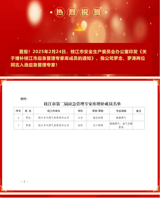 喜報!枝江市天然氣公司羅念、羅濤兩位同志榮膺市級應急管理專家稱號!
