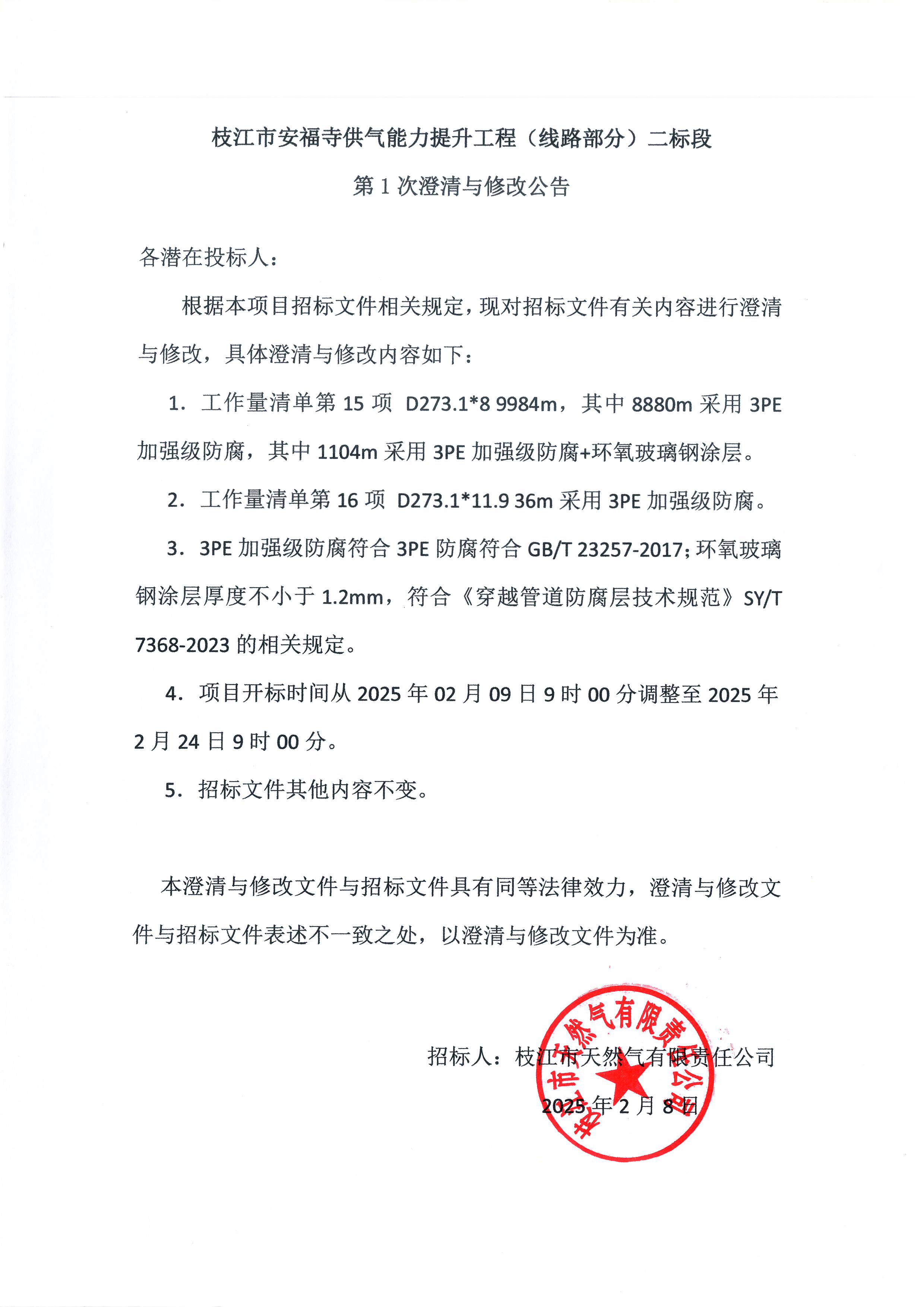 枝江市安福寺供氣能力提升工程(線路部分)二標段第1次澄清與修改公告