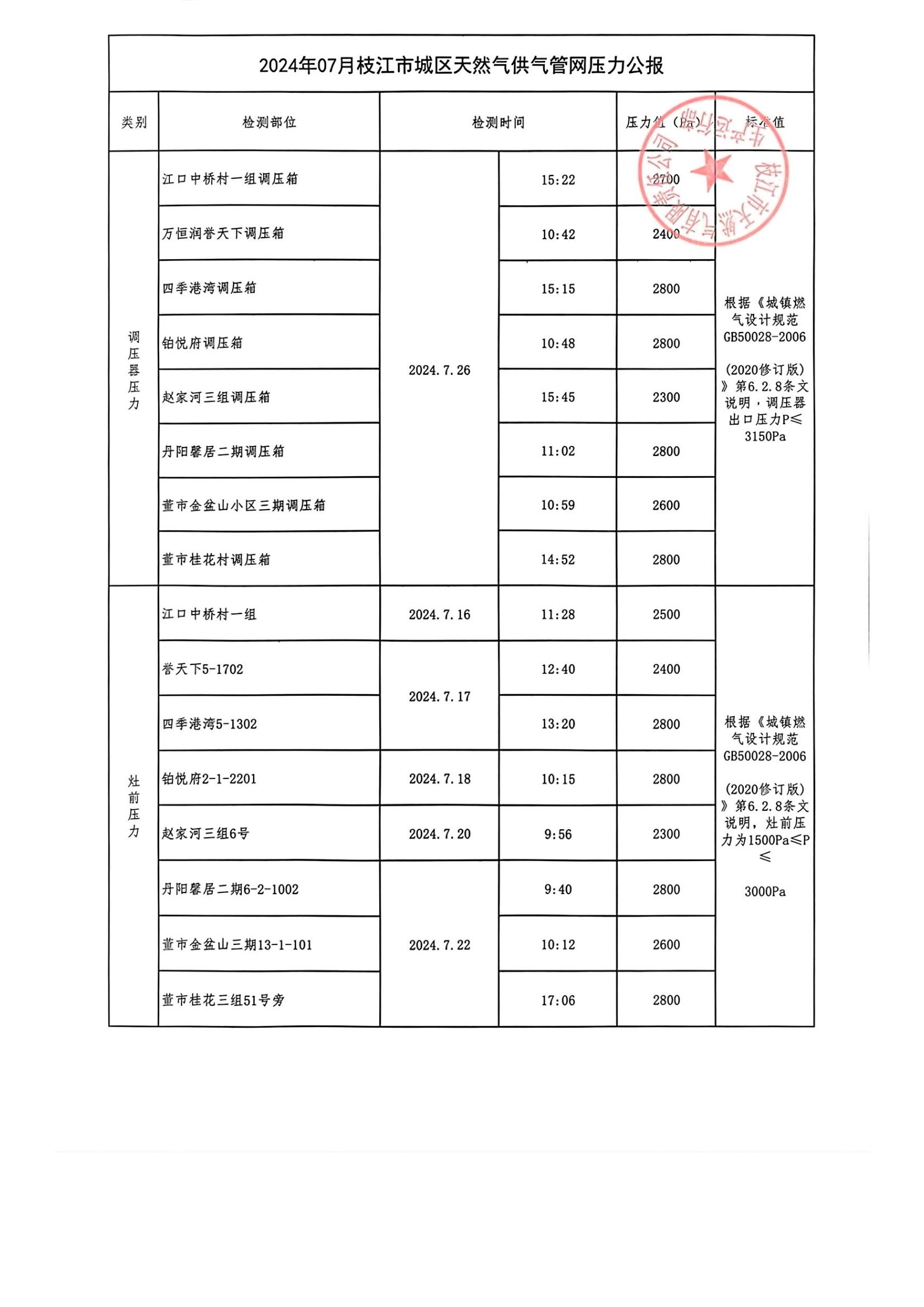 2024年7月枝江市城區(qū)天然氣供氣管網(wǎng)壓力公報